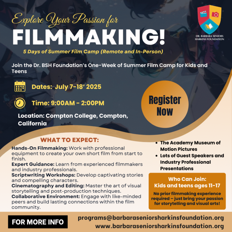 This hands-on Film Camp was created to teach young Filmmakers how to produce a Short Film Project. All Filmmakers will have the opportunity to learn firsthand from Award-Winning Filmmakers how to create a short film, plus they will also be able to collaborate with other young Filmmakers! Field trips include a visit to the Academy Museum of Motion Pictures, a Film Screening of a Summer movie, and another special surprise!