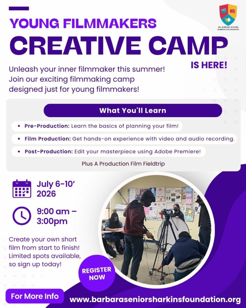 This hands-on Film Camp was created to teach young Filmmakers how to produce a Short Film Project. All Filmmakers will have the opportunity to learn firsthand from Award-Winning Filmmakers how to create a short film, plus they will also be able to collaborate with other young Filmmakers! Field trips include a visit to the Academy Museum of Motion Pictures or WB Studios, a Film Screening of a Summer movie, and another special surprise!