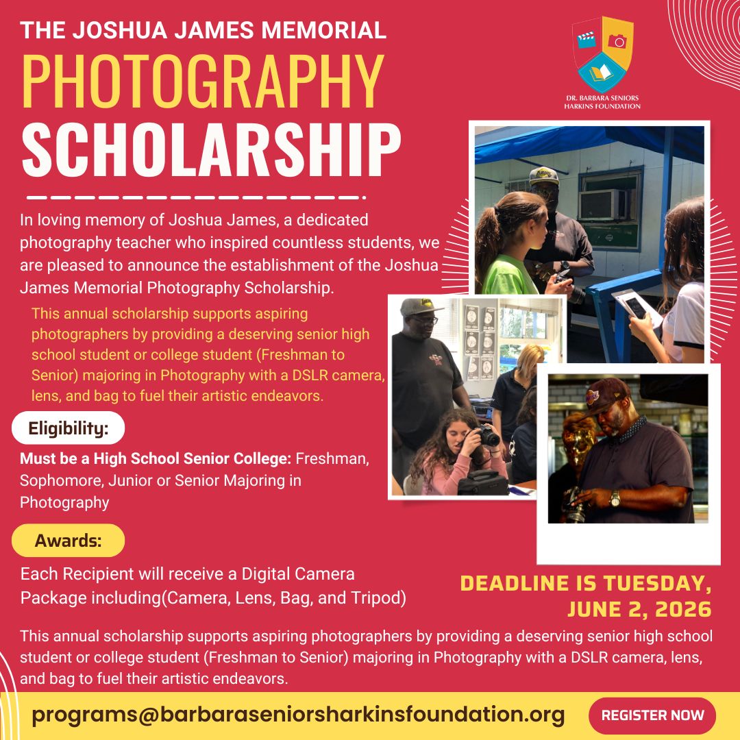 This annual scholarship supports aspiring photographers by providing a deserving senior high school student or college student (Freshman to Senior) majoring in Photography with a DSLR camera, lens, and bag to fuel their artistic endeavors.